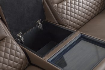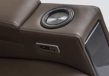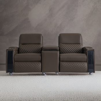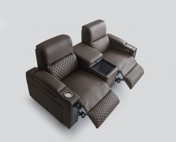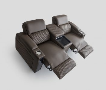 Anika Double VIP home theater seat model has a module between the seats. Seatings are reclinable by full motorized mechanism. There are practical and accessible storage areas, USB port and cup holders. You can